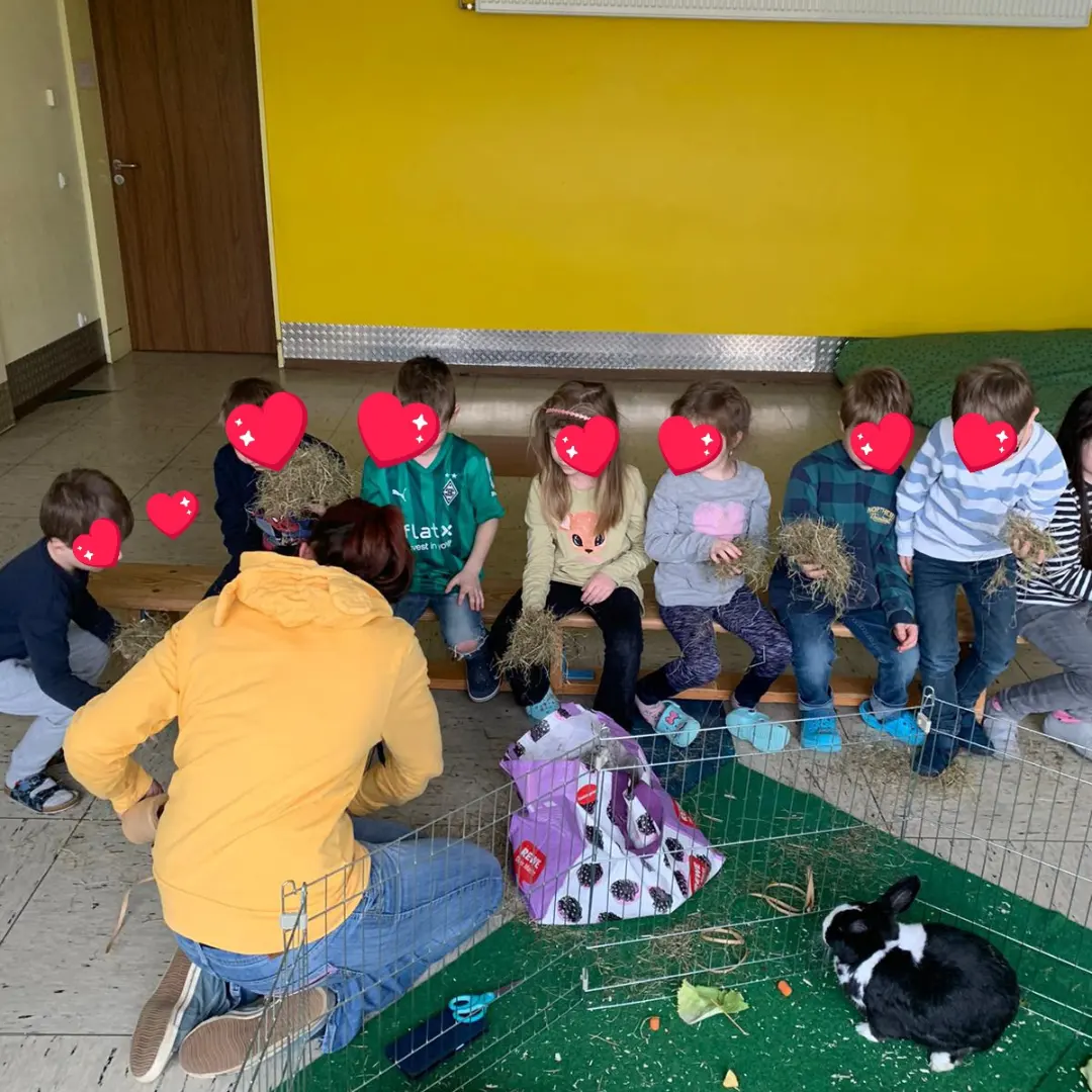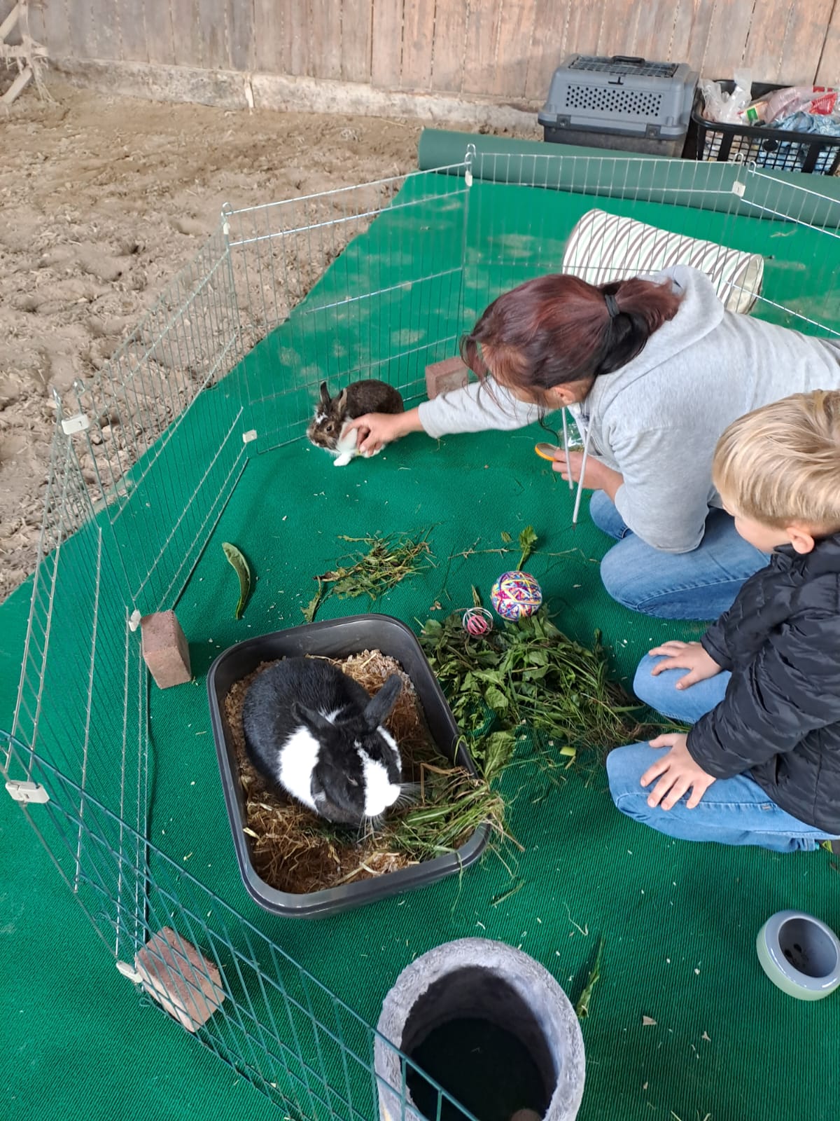 Die letzten 30 Minuten des Einsatzes wird dann die direkte und gezielte Interaktion mit den Kaninchen durchgeführt, indem sich ein Erwachsener oder zwei Kinder langsam in das Gehege setzt und versucht die Tiere mit ihren Leckerchen und dem Kommando „Komm“ zu locken.